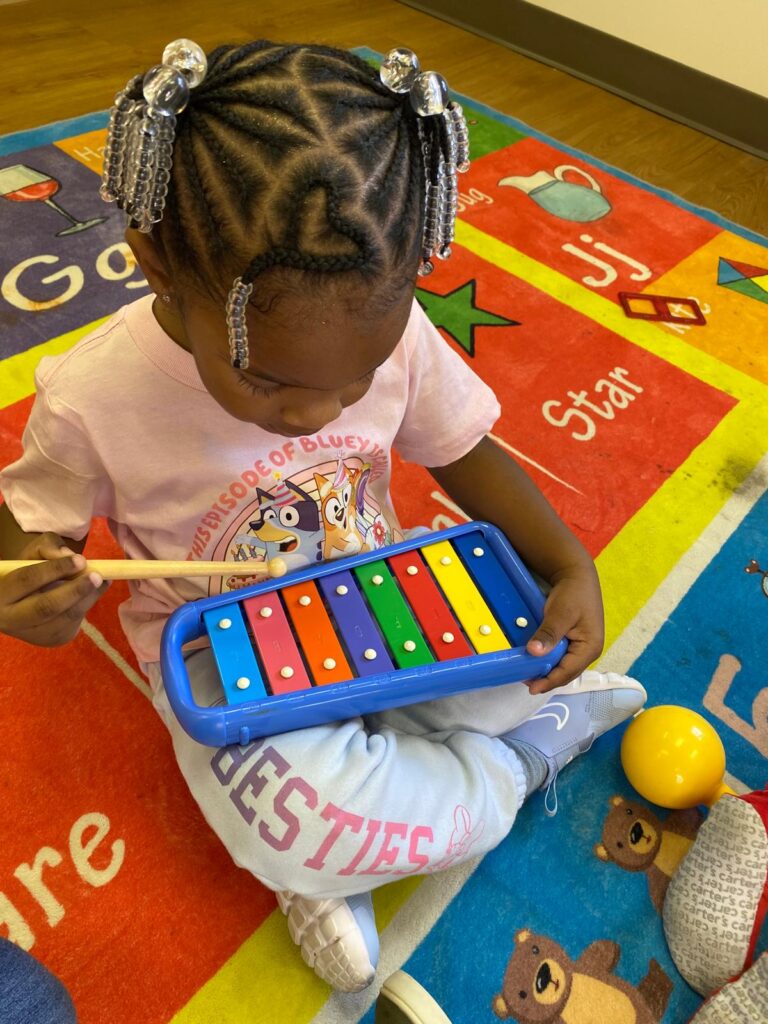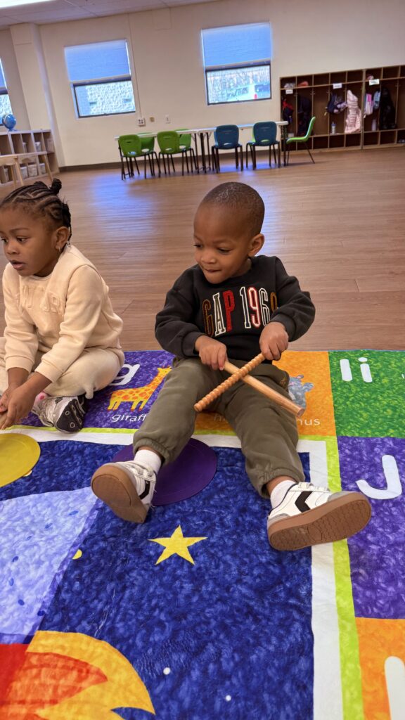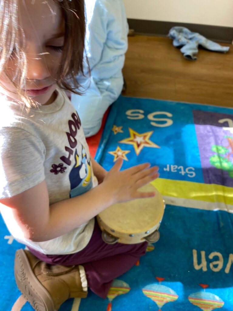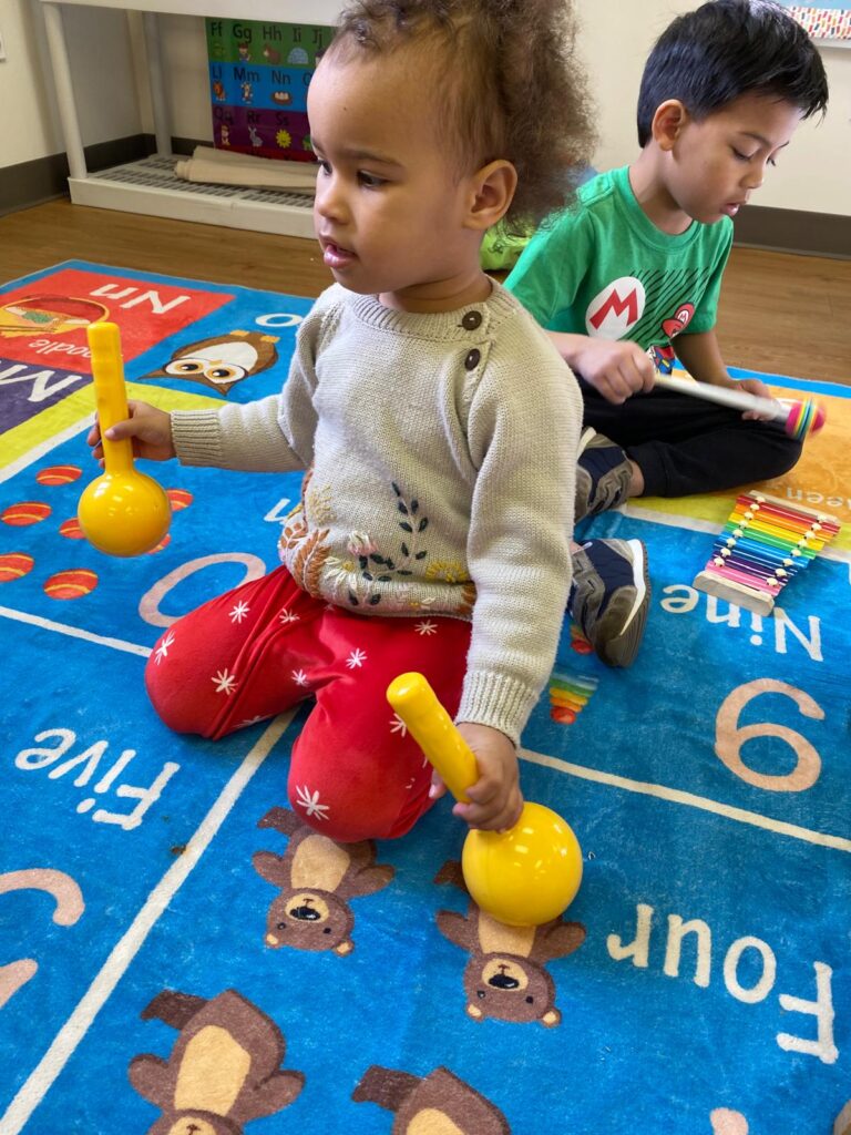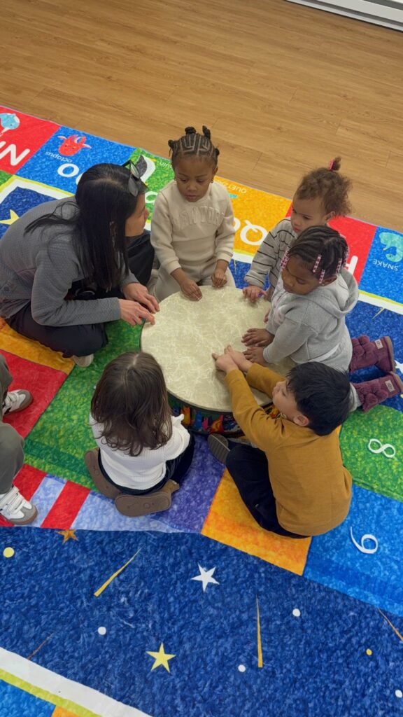 If you could peek into our classrooms on any given morning, here is what you might see: Miss Miki sitting cross-legged on the rug, a hand drum in the center of the circle, four little pairs of hands finding the beat alongside hers. Miss Camille guiding a group of toddlers through a rhythm game with wooden sticks — not because it is music time, but because it is transition time, and this is how she brings everyone back together. Miss M. holding a tambourine at eye level with a child who is just finding her confidence, waiting patiently for the moment she reaches out. Miss T. watching quietly as two children negotiate who gets the xylophone next — letting the social learning happen, knowing when to step in and when to step back.